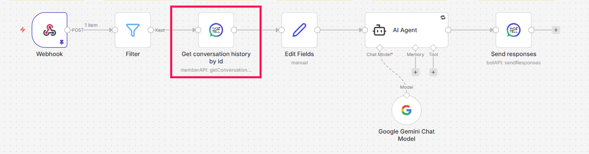 It uses the sender’s WhatsApp ID to retrieve up to 100 previous messages from WOZTELL. Without it, AI replies can feel disconnected.