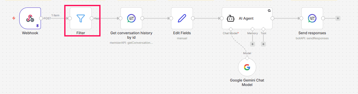 In this step, the filter is already configured and no additional settings are required. The Filter node ensures the AI only responds when appropriate.