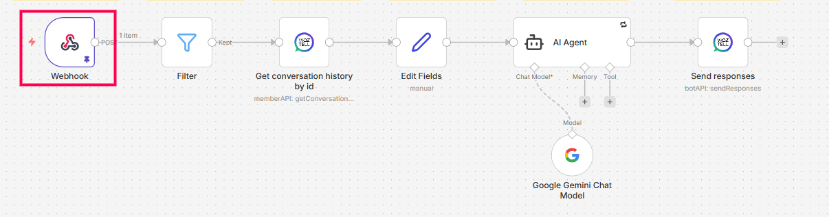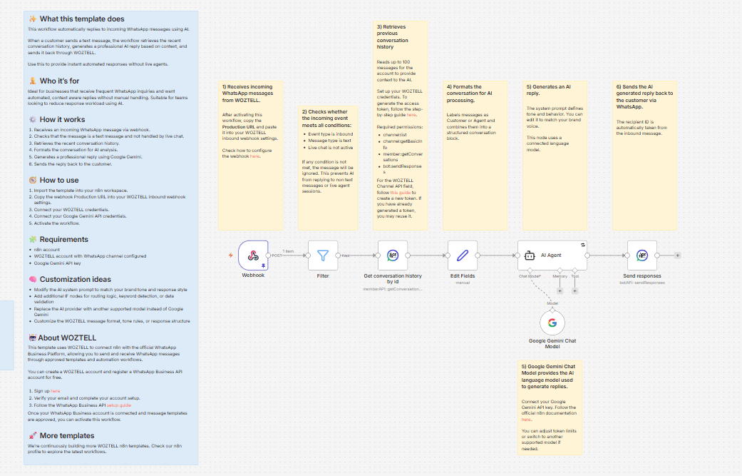 The Webhook node receives inbound WhatsApp messages from WOZTELL.