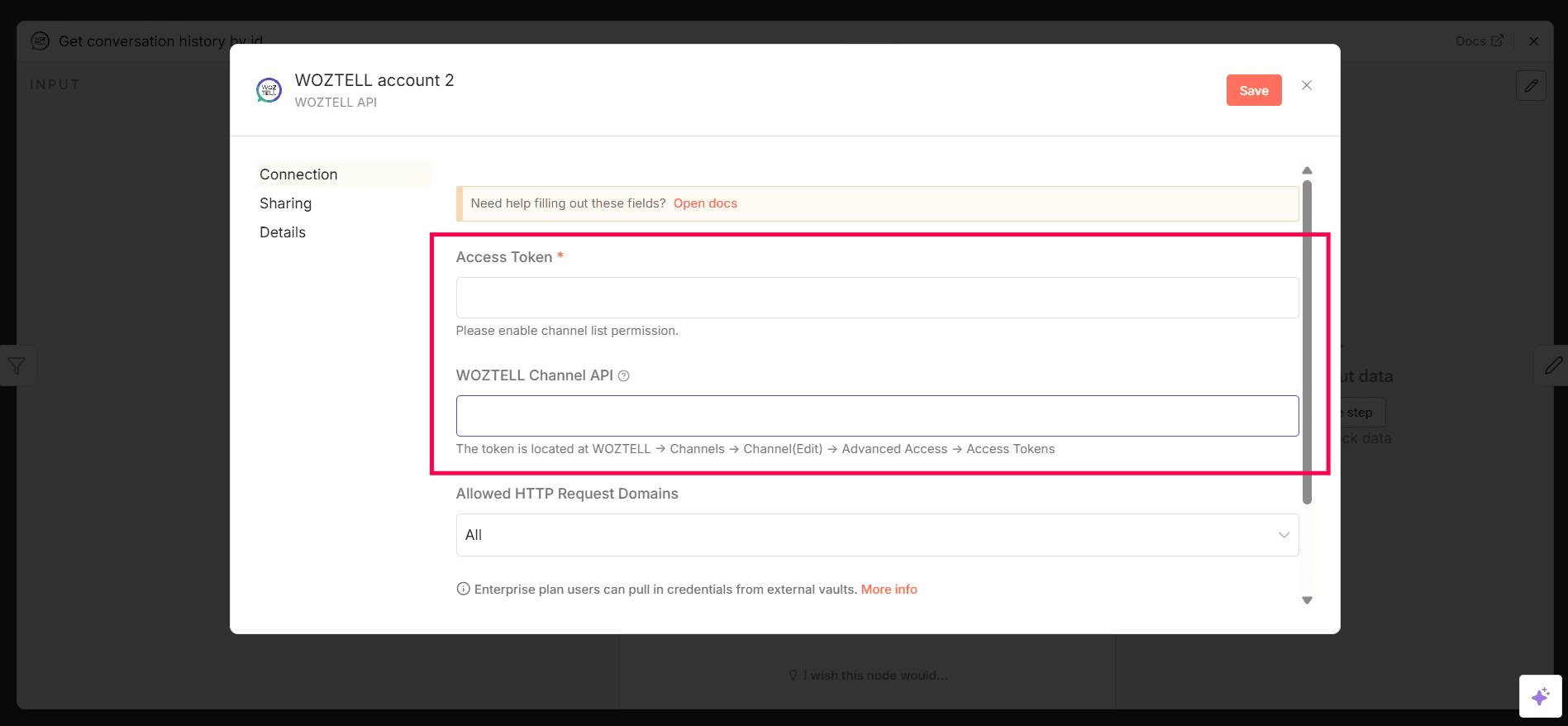 1. Connect your WOZTELL credentials. To generate the access token, follow the step-by-step guide here.