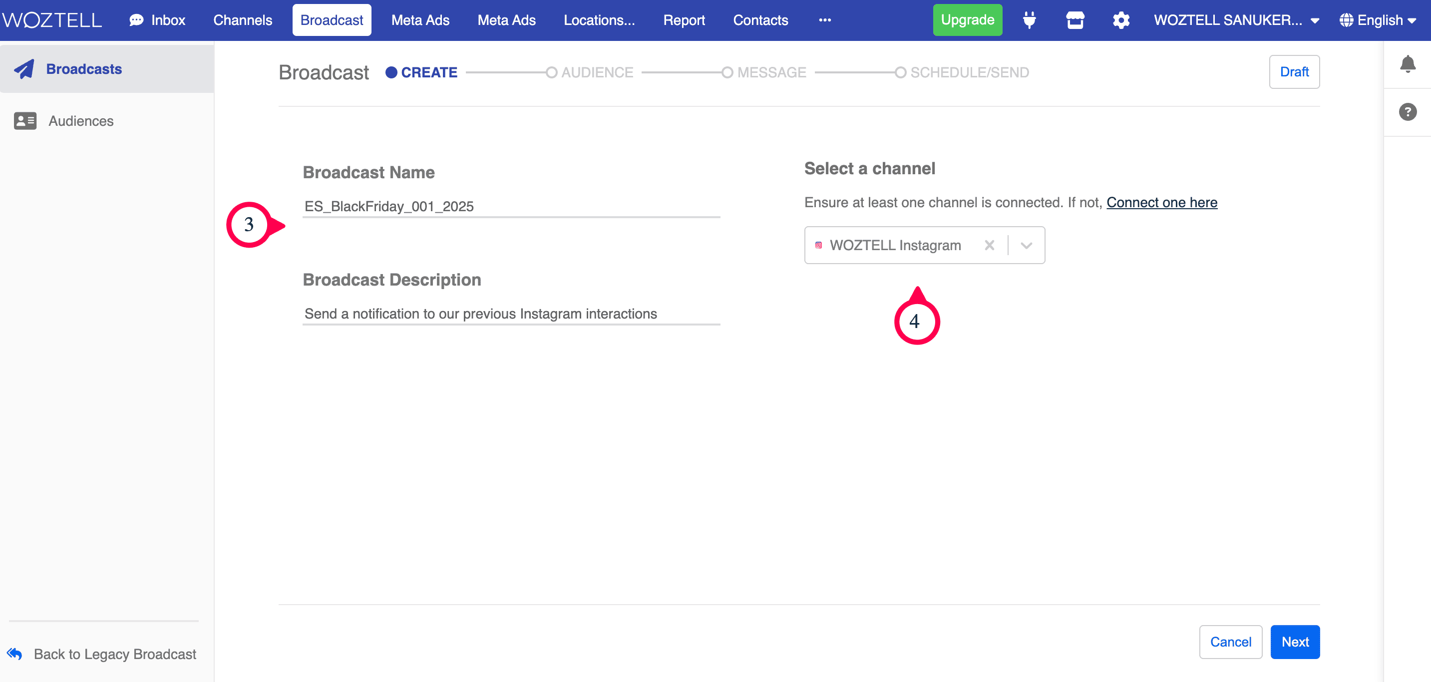4. On the right, select the Channel from which you want to send the message. To continue, click on "Next."