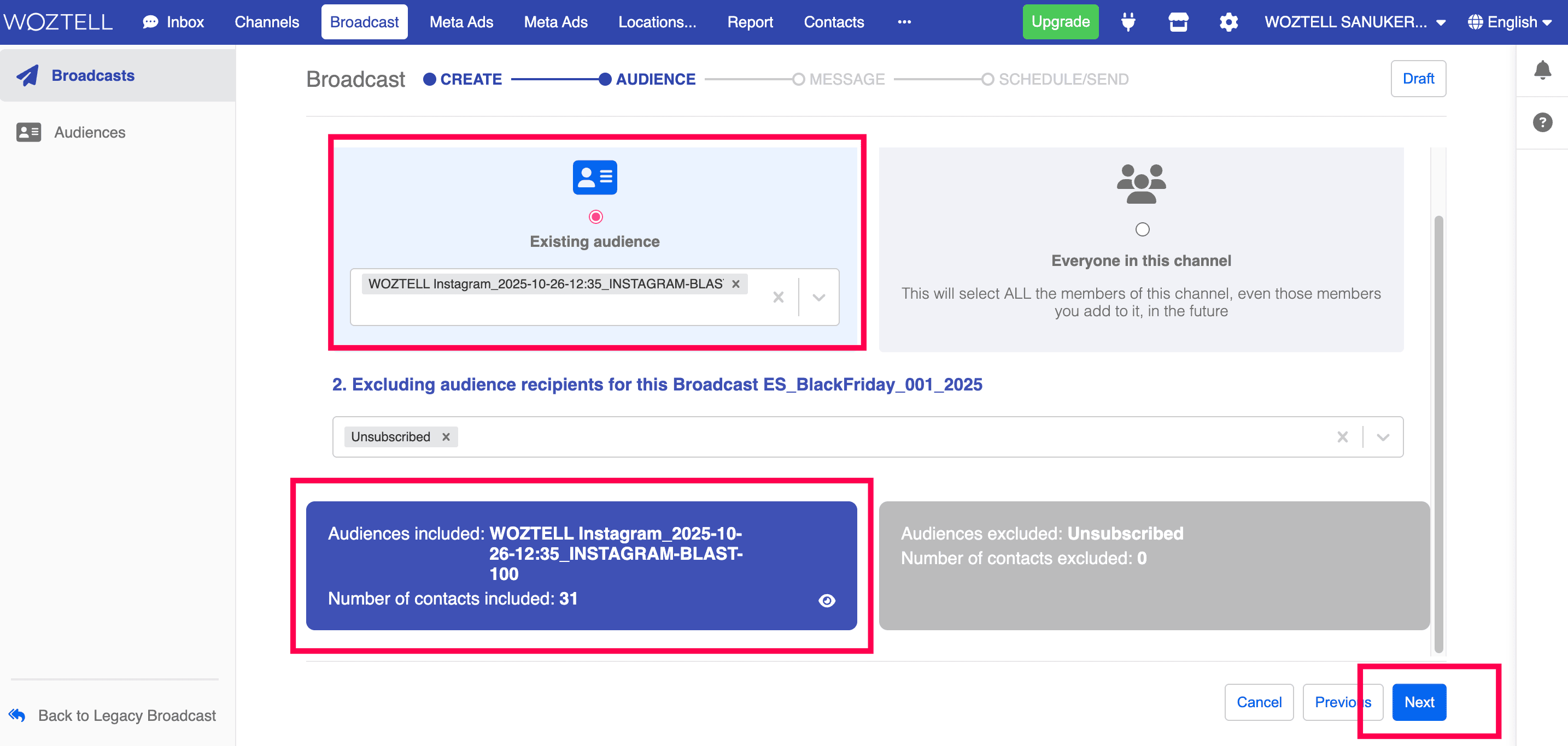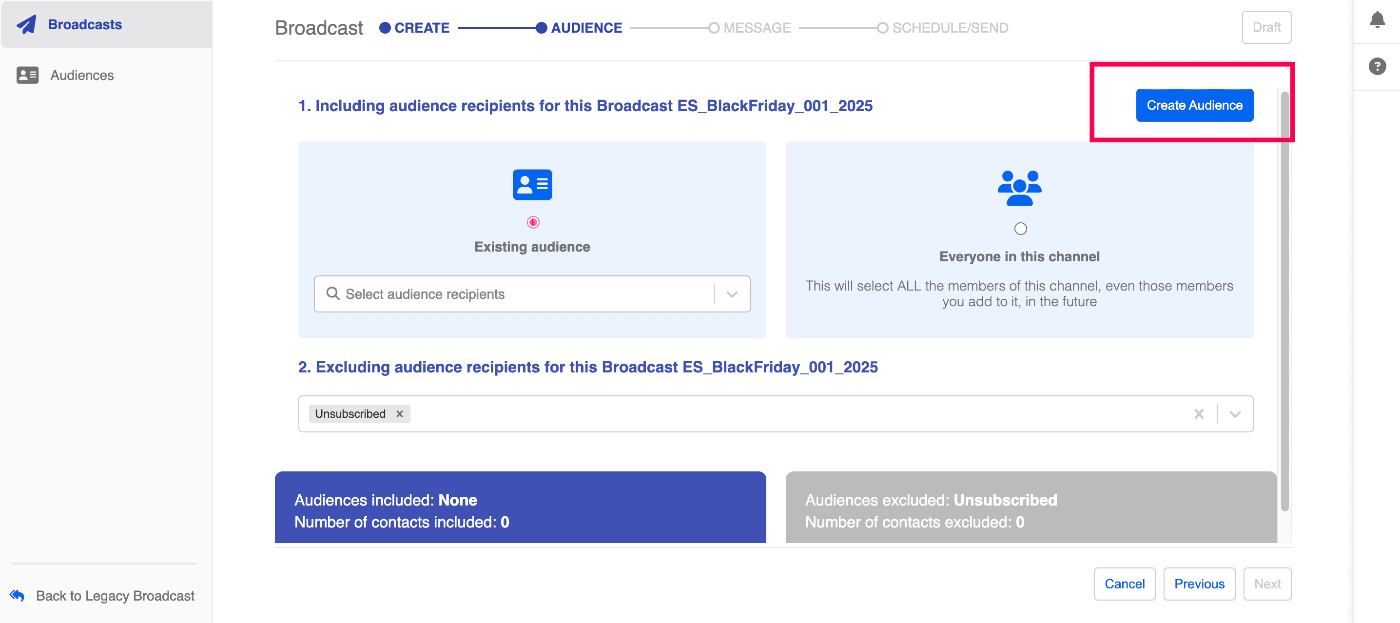 At the top, select the Audience for the Campaign or if you want to send the message to all users on the Channel.
