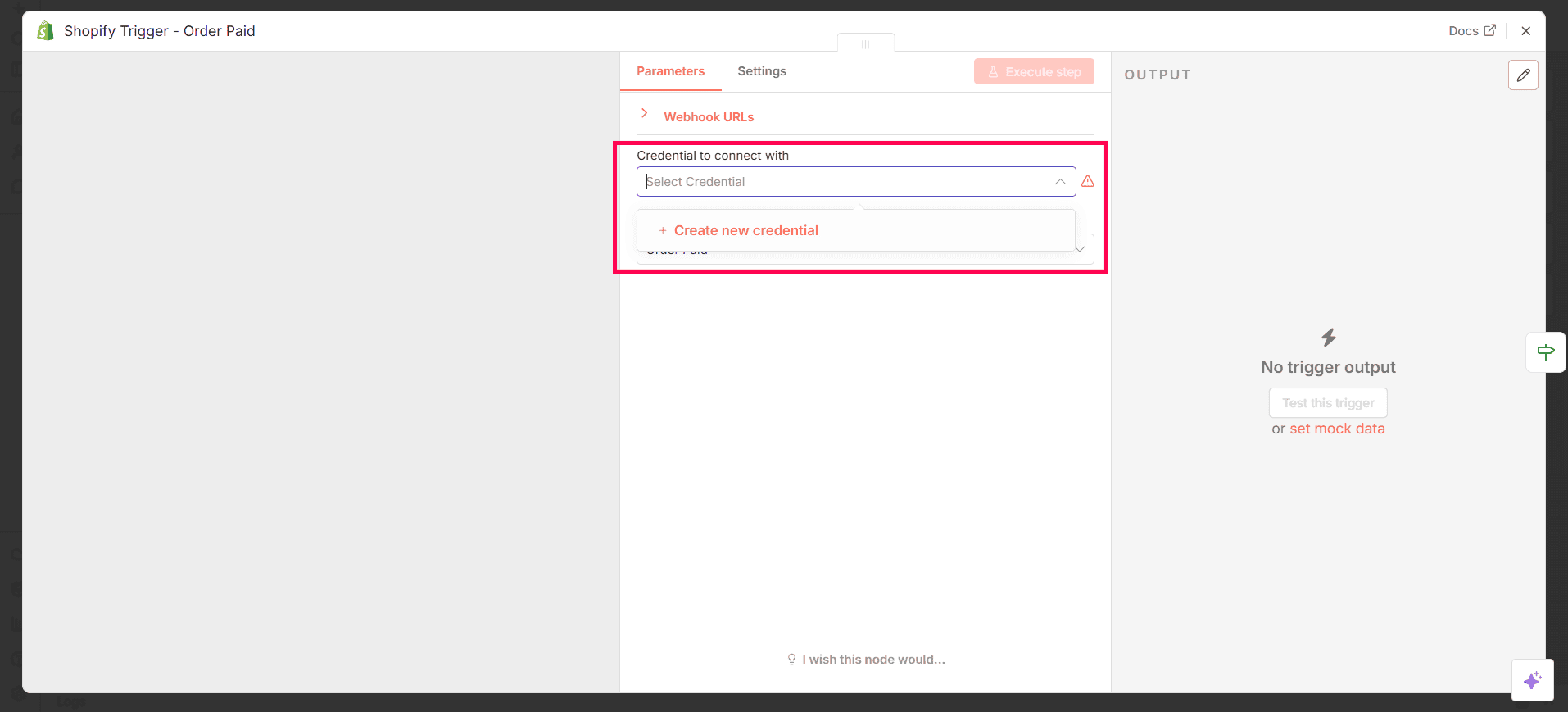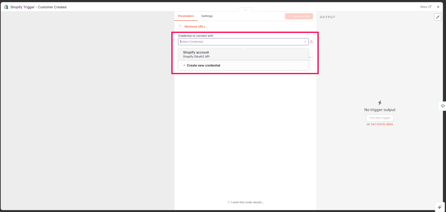 6. Now go back to n8n. Double click your Shopify node, under Credential to connect with, click Create new credential.