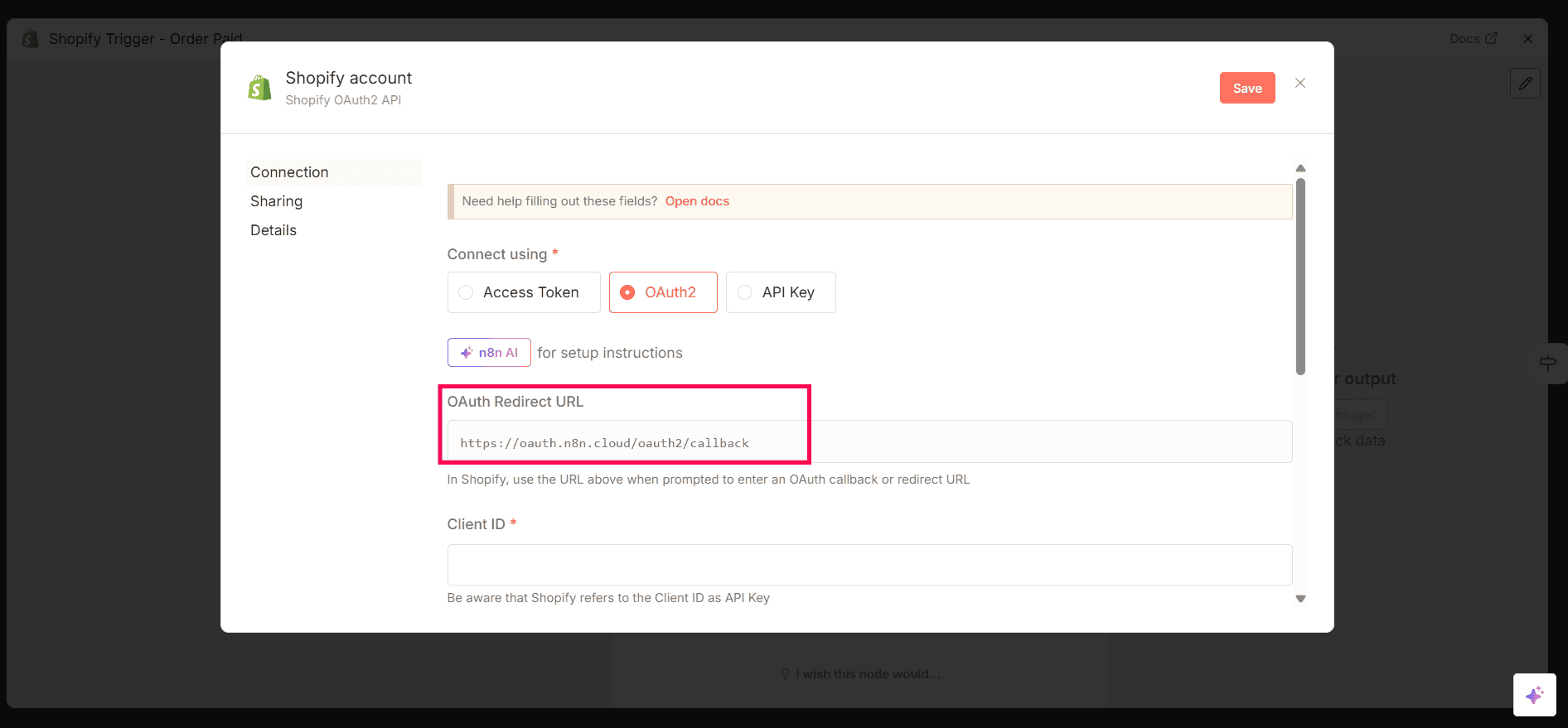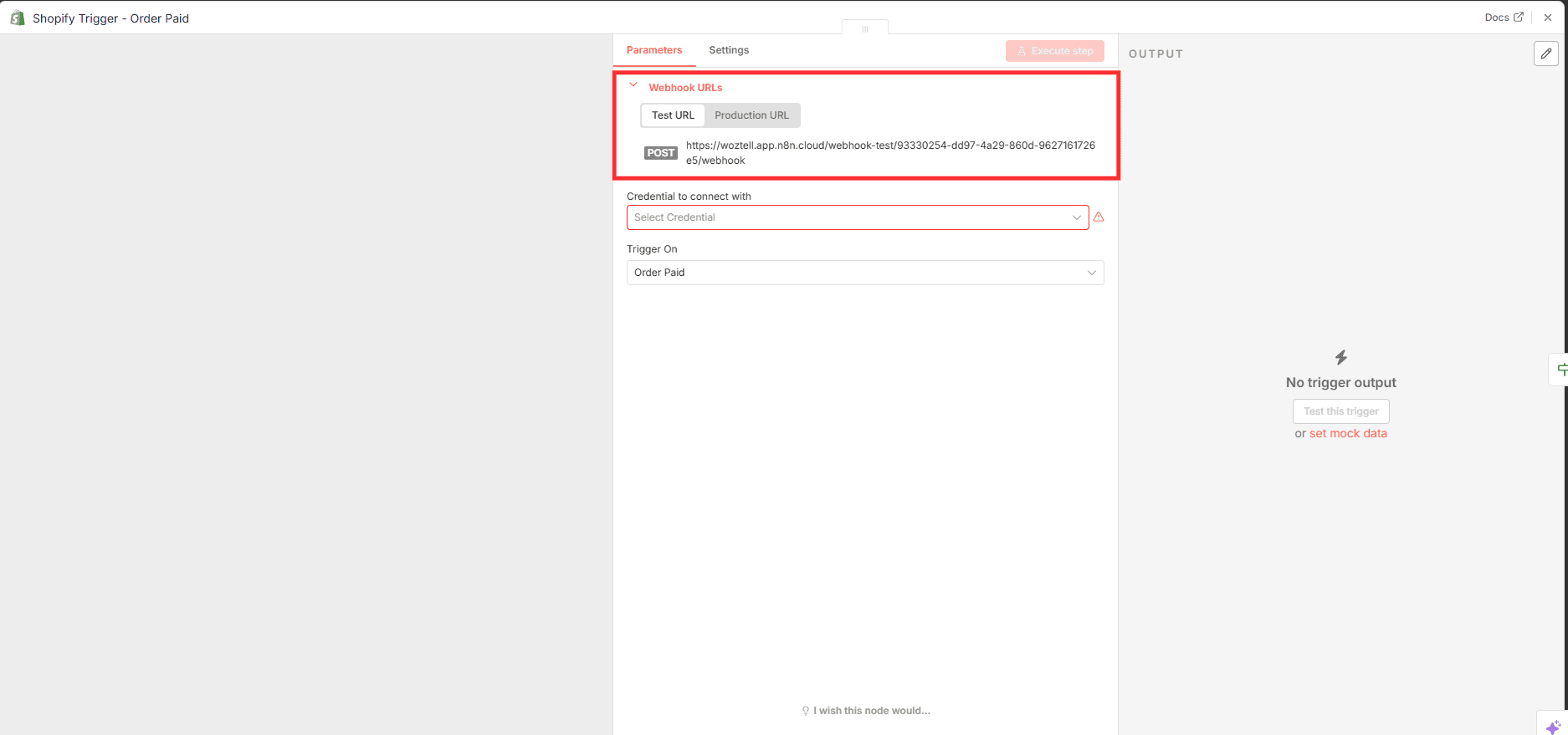 In n8n, double-click the Shopify Trigger node you want to use. Find the Webhook URL and copy it. Use Test URL while building and testing; Production URL when you’re ready to go live. Production URL works only when the workflow is published