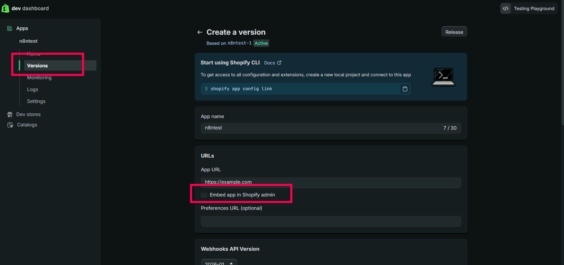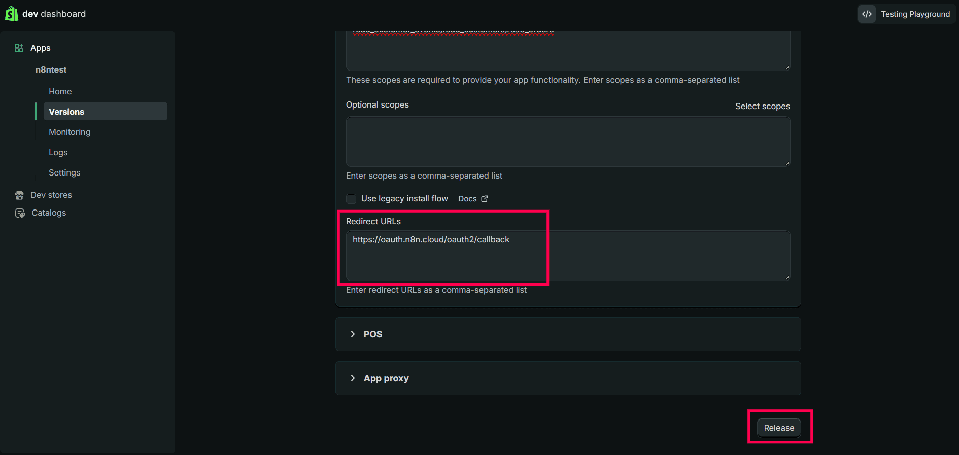 8. Go back to the Shopify dev dashboard. Paste the URL in the Redirect URLs and release the app. The version name and version message fields can be left empty since they are optional.