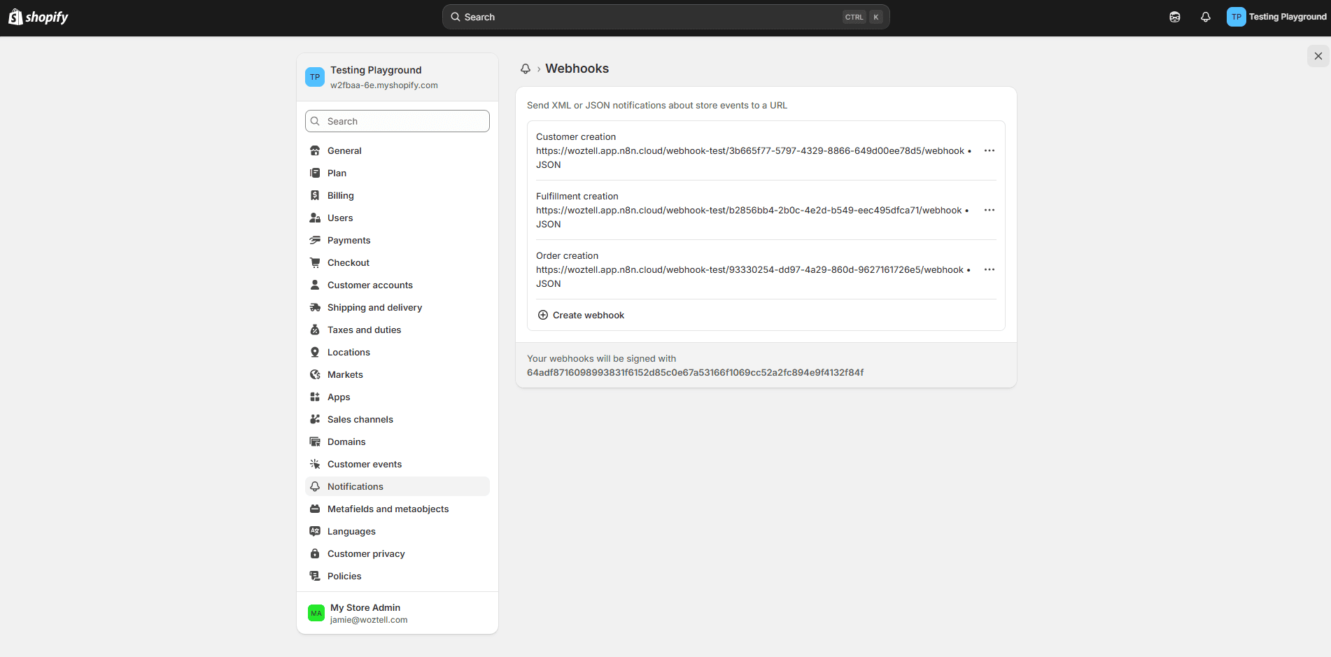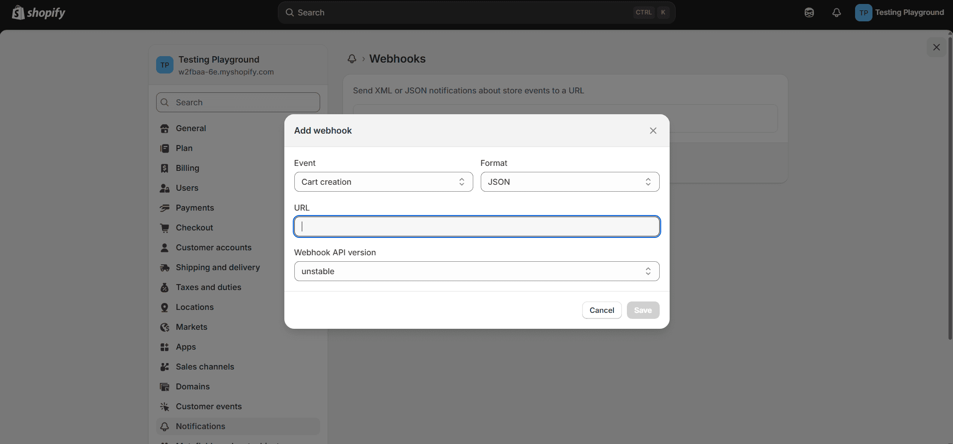 2. In Shopify Admin, go to Settings, find Notifications on the left panel and select Webhooks.