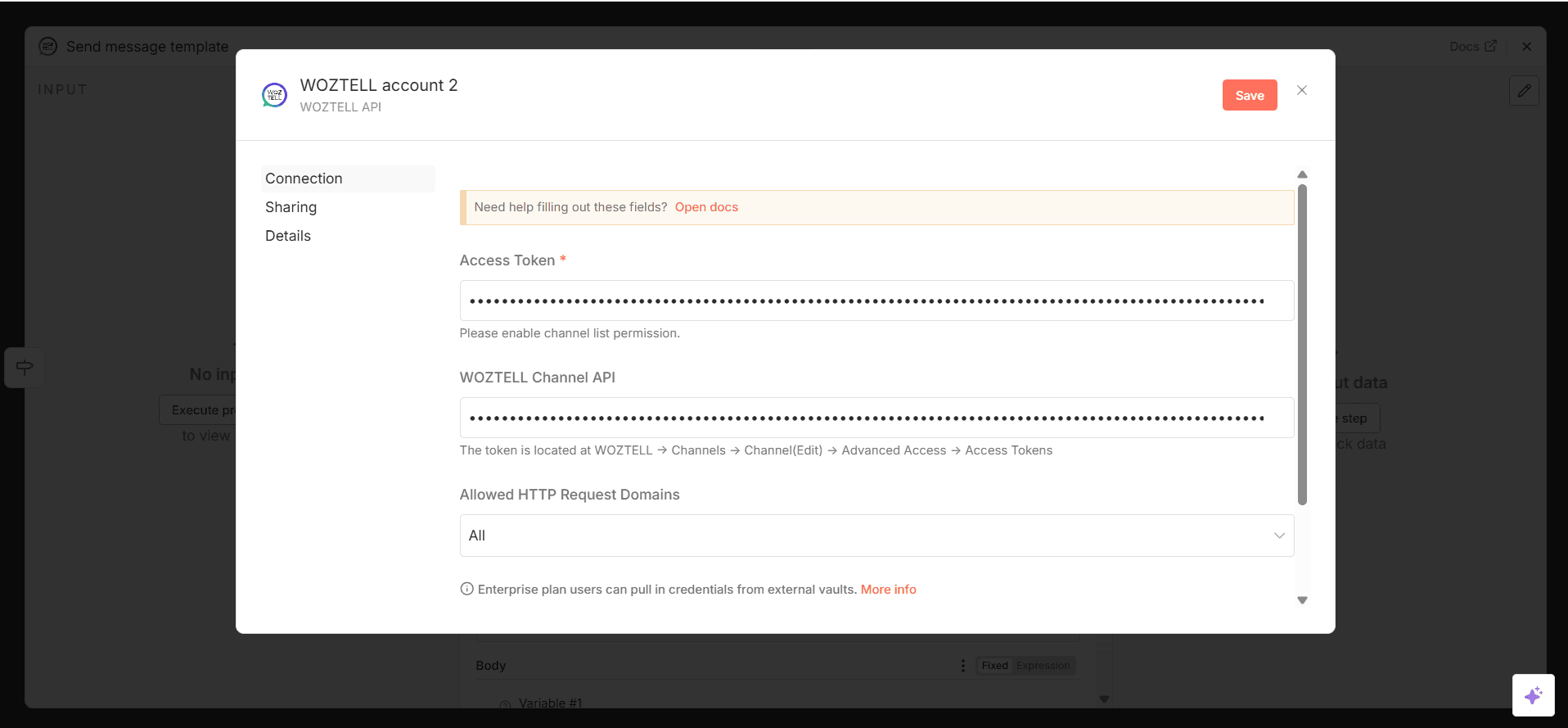 Copy the access token and return to the n8n WOZTELL node; paste the access token into the Access Token field. For WOZTELL Channel API field, follow the instructions below the input field. The token is located at WOZTELL -> Channels -> Channel(Edit)* -> Advanced Access -> Access Tokens