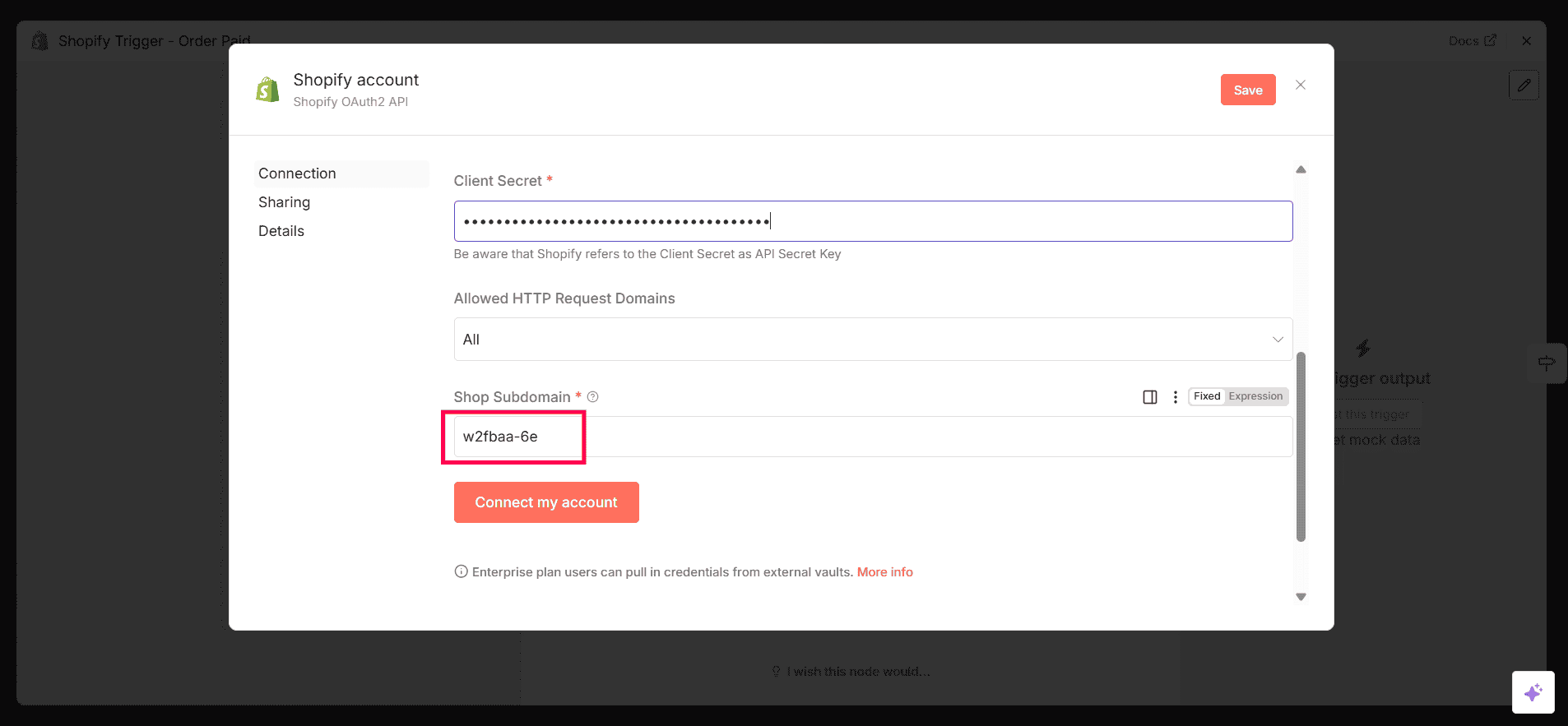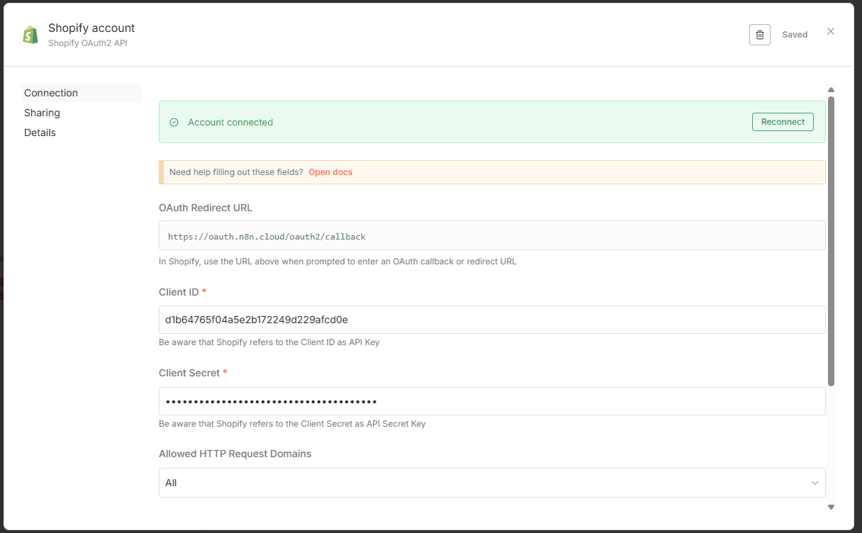 For other Shopify nodes in this workflow (or future workflows), you can reuse the same credential.