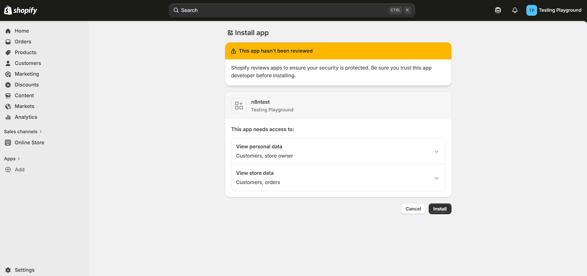 10. Select your store, and click install and review permissions. The permissions are based on the scopes you selected when creating the app.
