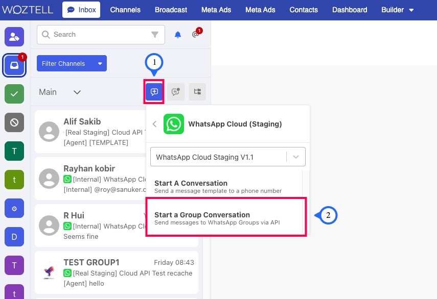 - Individual vs. group interaction: In 1:1 messaging, the conversation is between a business and a single user. This interaction is focused on personalized and direct communication. In groups, one message can reach multiple users at once. This enables mass communication, ideal for updates, announcements, or support to multiple people simultaneously.