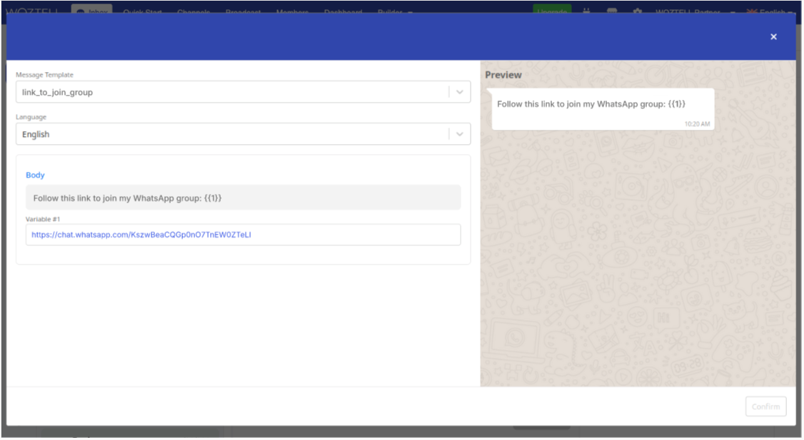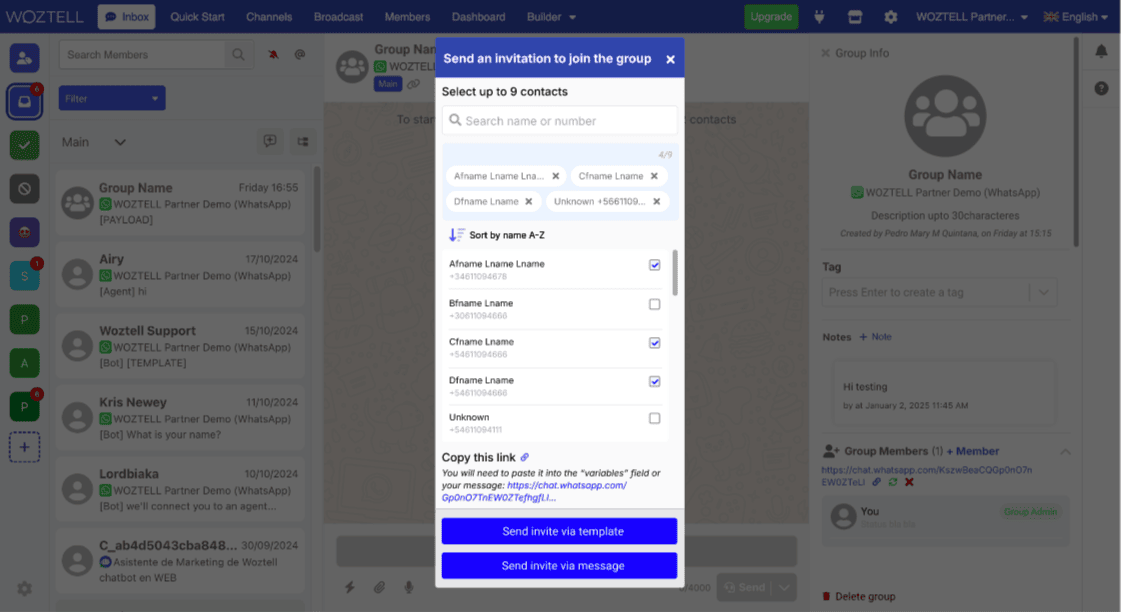 1. Invitation via template: send a template message from the same number you’ll use to invite them, following our flow. It will ask you to select the users who will receive this link to join.