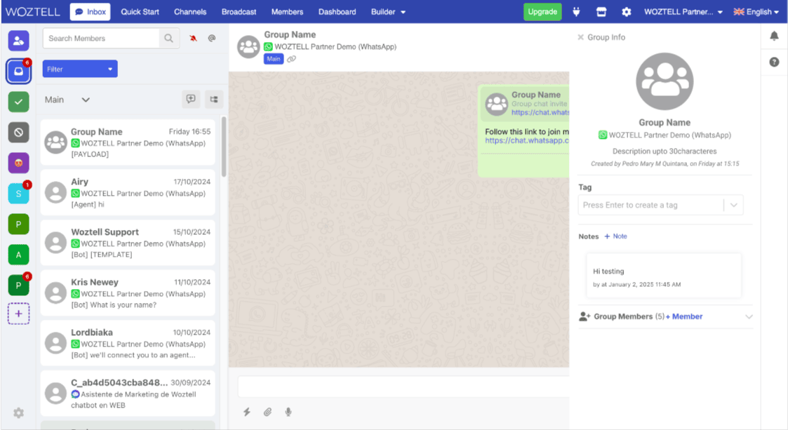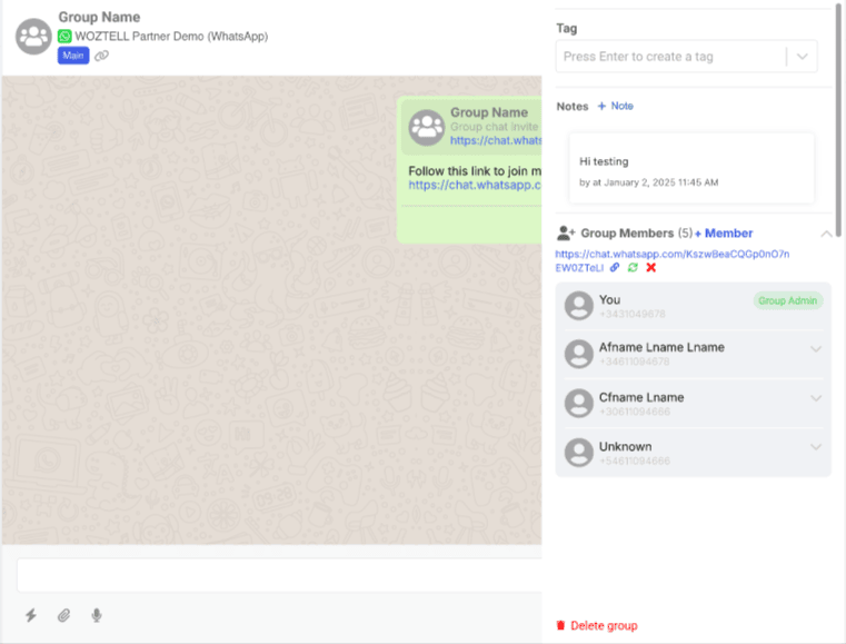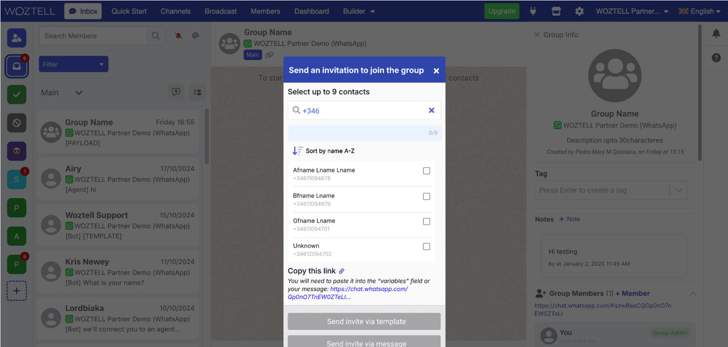 - Invite groups: these groups are managed via an invitation link that you can share with the users you want. Only those who receive the link can join the group, offering greater control over who can access the conversation. Admins can generate and manage the invite links through WOZTELL.