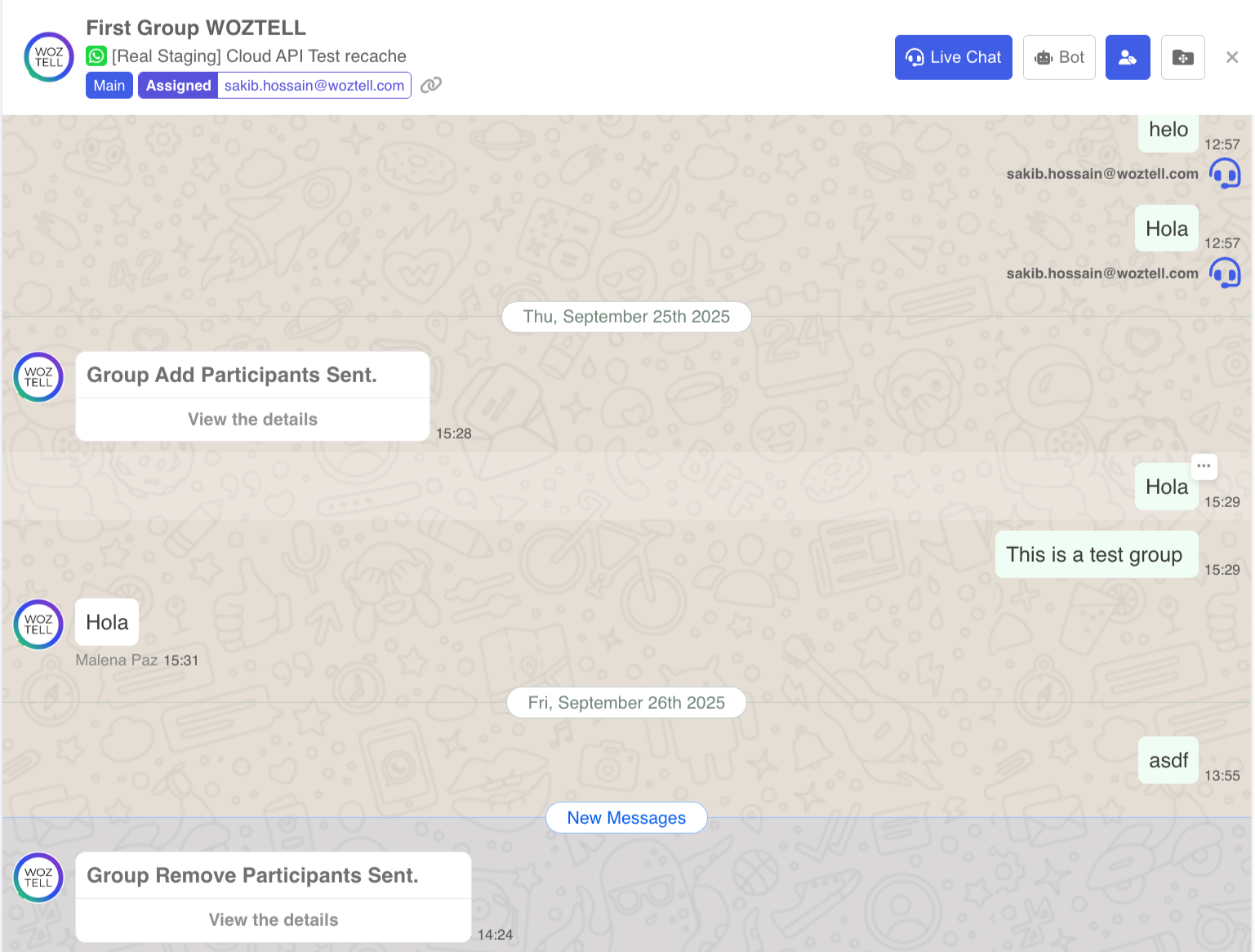 - When any WhatsApp user in the group sends you a message, it opens (or refreshes, if already open) a support window between you and the entire group. This allows you to send utility or marketing template messages, or session messages, free of charge.