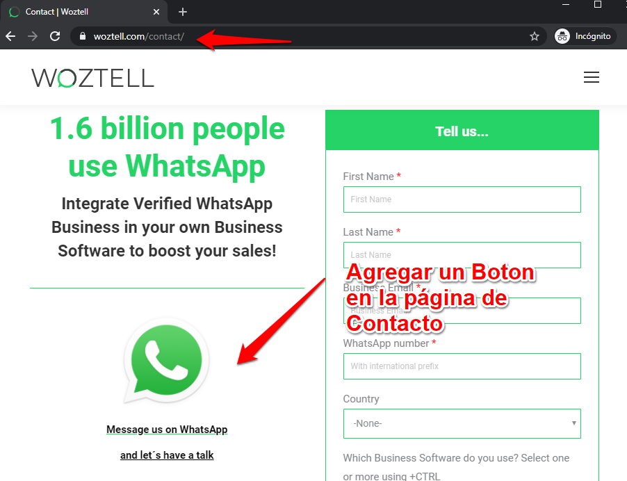 Los usuarios que hayan llegado a la página de Contacto, usualmente llegan a esta página para realizar de manera pro-activa una acción ya sea rellenar un formulario o enviar un correo electrónico. Se recomienda agregar un Botón de WhatsApp para permitir al visitante un contacto directo con la empresa.